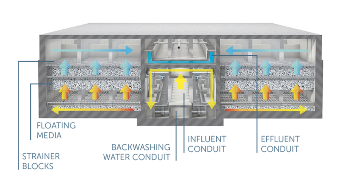 - Influent flows upwards through a packed bed of Proteus media beads, where particulates are trapped, and through a strainer box that retains the media